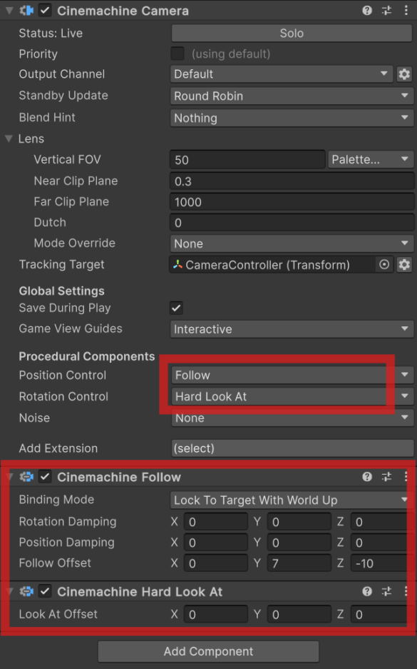 CinemachineCamera -> Procedural Components -> Position Control -> Follow (Component) CinemachineCamera -> Procedural Components -> Rotation Control -> Hard Look At